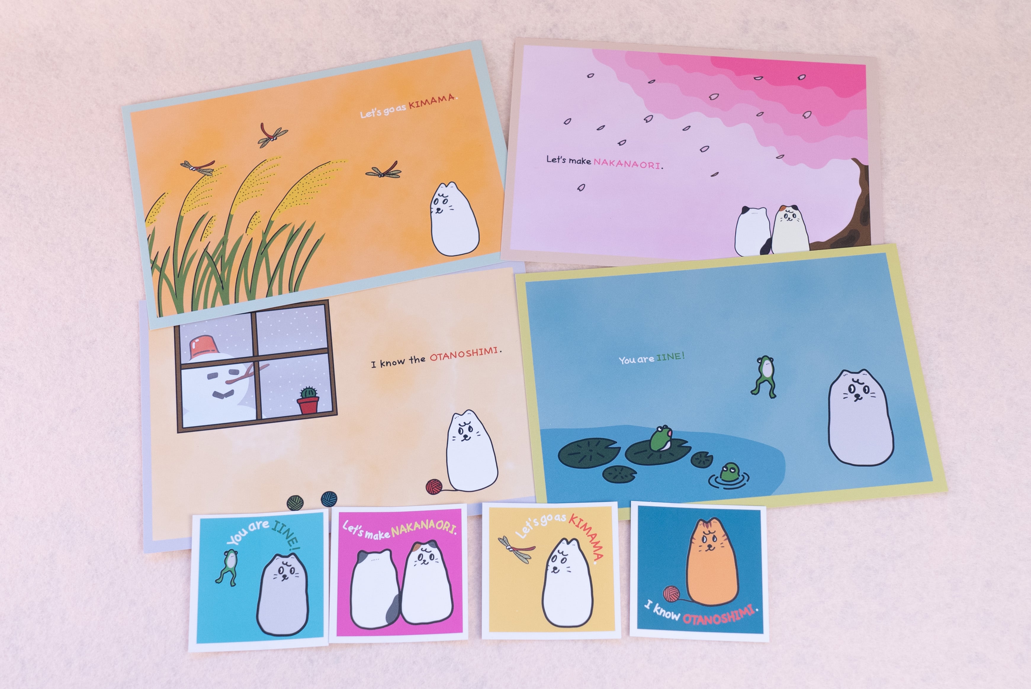 NANAIDOの張り子猫をポストカードにしました。 四季を表現した4種類のカードをご用意しました。手紙やプレゼントに添えたり、フォトフレームに入れて飾ったりしてお楽しみください。 サイズ:100 X 148mm 紙:マットコート 220kg